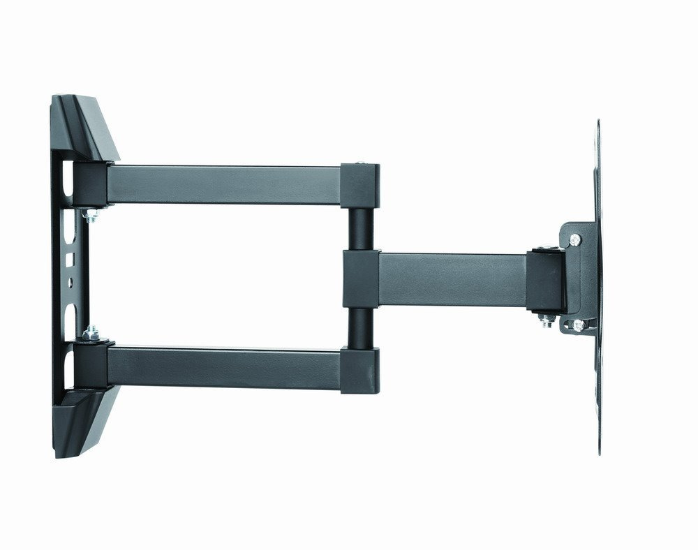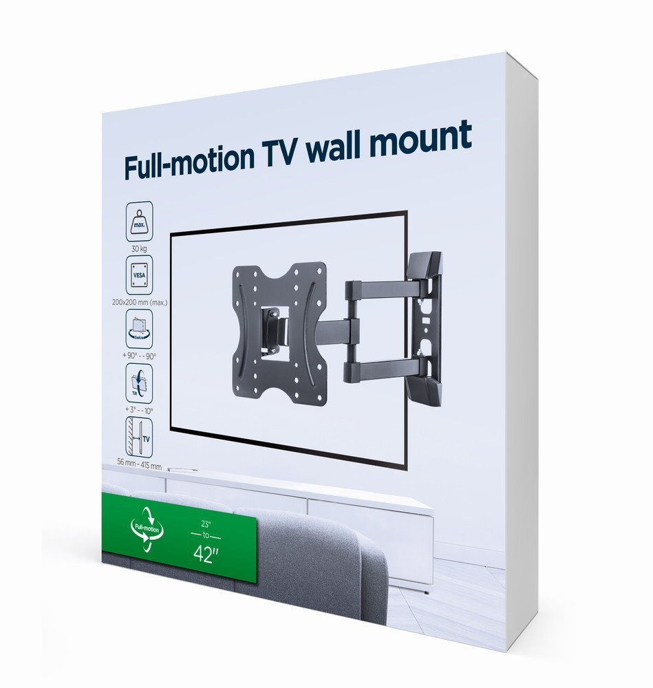 Jednoramenný nastavitelný nástěnný držák na TV Podporuje většinu 23" - 42" LCD/LED televizorů Kompatibilní se standardem VESA, max. 200 x 200 mm Vzdálenost stěn 56 - 415 mm Umožňuje nastavit až o 180 stupňů a naklápění o 13 stupňů Obsahuje veškerý potřebný instalační materiál Specifikace Materiál: ocel, plast Povrchová úprava: práškový lak Barva: černá Vhodné pro velikost obrazovky: 23" - 42" Kompatibilní s VESA: 100 x 100, 200 x 100, 200 x 200 mm Nosnost: 30 kg Profil: 56 ~ 415 mm Rozsah náklonu: +3 ° ~ -10 ° Rozsah otáčení: +90 ° ~ -90 ° Instalace: pevná stěna, jednoduchý sloupek Vedení kabelů: Ne Čistá hmotnost: 2,14 kg Rozměry: 415 x 230 x 278 mm