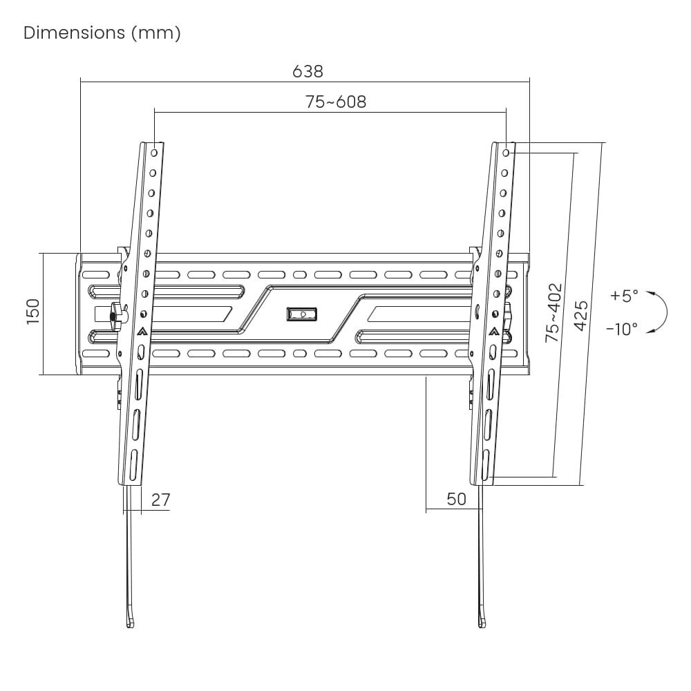 Těžký ocelový držák na stěnu pro LCD obrazovku Podporuje většinu 37„ - 86“ LCD televizorů Kompatibilní se standardem VESA, max. 600 x 400 mm Umožňuje náklon až o 15 Snadno uchopitelné knoflíky pro rychlé nastavení náklonu Automatické pružinové zámky s rychloupínacími šňůrami umožňují snadné upevnění a vyjmutí televizoru Praktická integrovaná bublinková váha pro dokonalé vyrovnání Vzdálenost od stěny: 50 mm Obsahuje veškerý potřebný instalační materiál Specifikace Materiál: ocel Povrchová úprava: práškový lak Barva: jemná černá textura Podporované velikosti obrazovky: 37"- 86" Kompatibilní s VESA: 75x75, 100x100, 100x150, 150x100, 100x200, 200x100, 150x150, 200x200, 200x300, 300x200, 200x400, 400x200, 300x300, 300x400, 400x300, 600x200, 500x300, 400x400, 600x300, 500x400, 600x400 Nosnost: 75 kg Profil: 50 mm Rozsah náklonu: 5° ~ -10° Rozsah otáčení: Úroveň stínítka : není k dispozici Instalace: pevná stěna, dvojitý sloupek (406 mm / 450 mm / 600 mm)