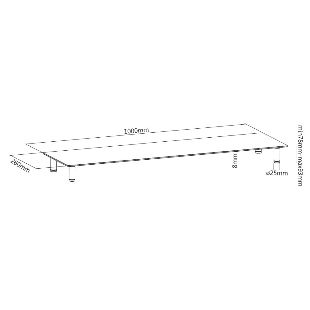 Stojan na monitor/notebook z tvrzeného skla Extra dlouhá konstrukce poskytuje dostatek místa pro 2 monitory Obdélníkový tvar, perfektně se hodí na každý stůl Výškově nastavitelné nohy pro optimální polohování a pozorovací úhel Specifikace Materiál: Nerezová ocel, tvrzené sklo Kapacita police: 2 monitory Nastavení výšky: 78 - 93 mm Nosnost: 20 kg Čistá hmotnost: 5,95 kg Rozměry: Rozměry: 1000 x 260 x 93 mm