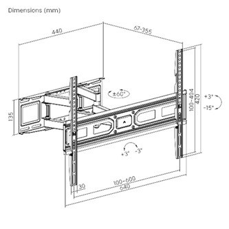 Vlastnosti produktu: Velikost obrazovky: 37 - 80 palců / 94 - 203 cm Nosnost: až 40 kg Montáž: od VESA 100x100 do VESA 600x400 Vzdálenost od stěny: 67 - 355 mm Vertikální náklon: +3° až -15° Horizontální rotace: +60° až -60° Horizontální náklon: +3° až -3°