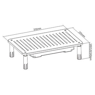Specifikace Vhodný pro: notebook, monitor Vhodná velikost obrazovky: 13" ~ 32" Nastavitelná výška: 10/12/14 cm Materiál: ocel + plast Rozměry: 370 x 235 x 140 mm Tloušťka povrchu: 0,9 cm Nosnost: 20 kg