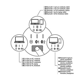 Powerton LIFE ULTRASLIM klávesnice nabízí hned tři možnosti připojení současně. První z nich je bezdrátový 2.4 GHz přijímač, který nejlépe využijete pro připojení k počítači nebo notebooku. Další dvě možnosti nabízí spárování s různými zařízeními přes Bluetooth 4.2. Můžete tak klávesnici připojit také ke smartphonu, tabletu, televizi nebo dalšímu notebooku. A co je na tom úplně super? Že se mezi jednotlivými připojenými zařízeními přepínáte pouhým stiskem klávesy. Tak snadné to je. Klávesnice má navíc paměťovou funkci. Pokud používáte např. kanál Bluetooth 1 a klávesnici vypnete, po zapnutí se opět připojí k zařízení, které je spárováno v kanálu Bluetooth 1.