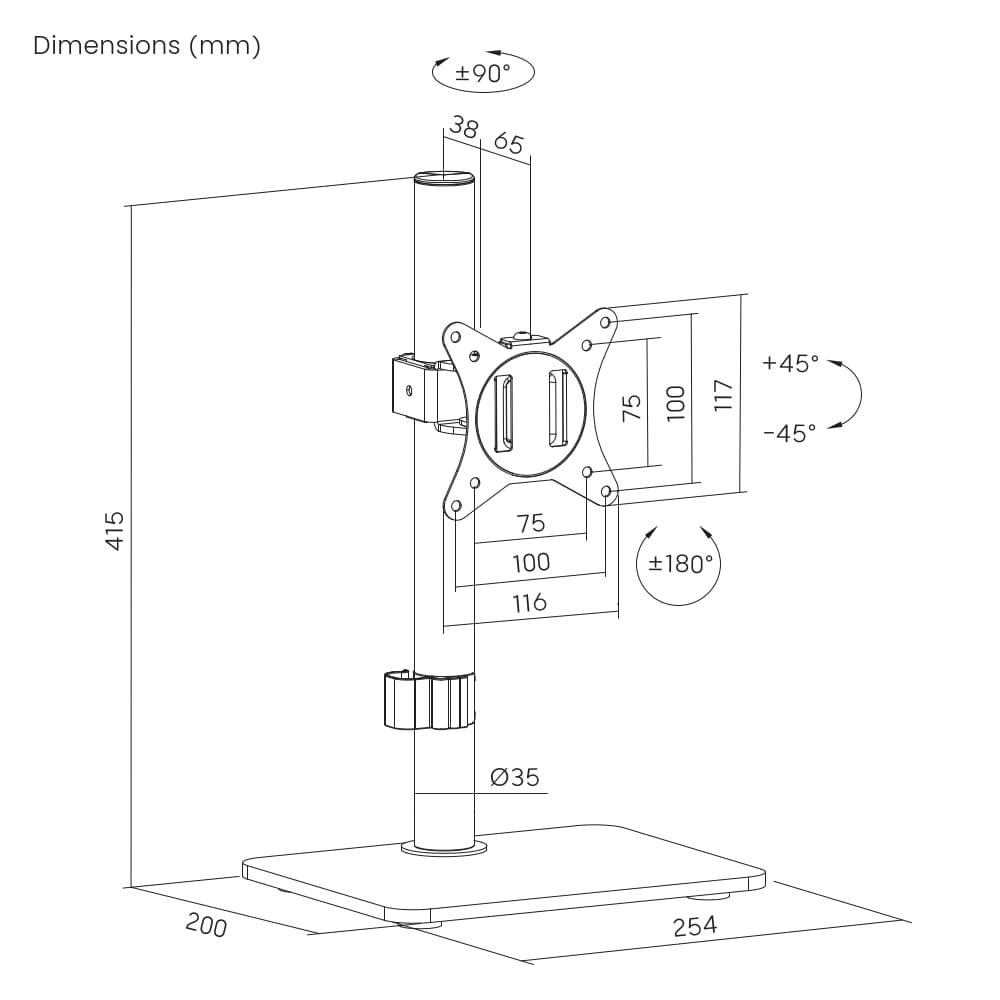 Výškově nastavitelný stolní na monitor s podstavcem z tvrzeného skla Snadné plynulé nastavení výšky až do 420 mm Umožňuje nastavit a naklápění displeje a displeje z režimu na šířku do režimu na výšku funguje téměř s každým LCD monitorem (max. 32“ / 9 kg) Stabilní skleněná základová deska pro umístění bezpečně, na jakýkoli stůl Vestavěné vedení kabelů pro maximální organizovaný a organizovaný přehled 100 mm Specifikace Materiál: Ocel, plast, tvrzené sklo Povrchová úprava: práškový nástřik Barva: Matná černá Vhodná pro velikost obrazovky: 17" - 32" Nosnost: max. 9 kg Kompatibilní s VESA: 75 x 75, 100 x 100 mm Nastavení výšky: max. 420 mm Rozsah náklonu: +45 ° ~ -45 ° Rozsah otáčení: +90 ° ~ -90 ° Rotace obrazovky: +180 ° ~ -180 ° Čistá hmotnost: 2,5 kg Rozměry: 390 x 280 x 454 mm