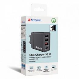Popis produktu Verbatim Síťový adaptér 30W, 4 porty, 1x USB-C, 3x USB-A
